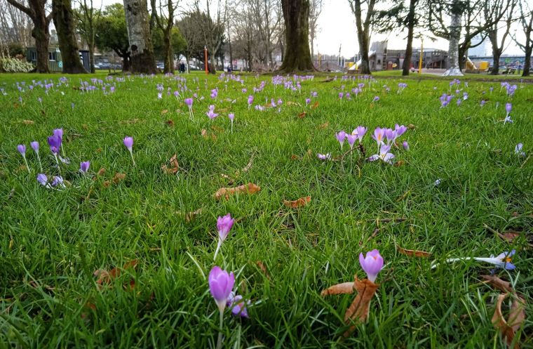 И большой газон ярко-зелёной травы с фиолетовыми крокусами.
