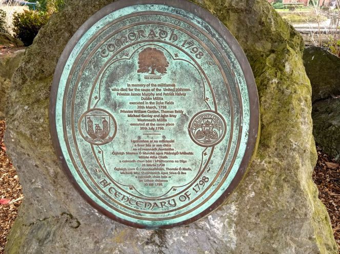 А на отдельно стоящем камне большая бронзовая плита круглой формы с мемориальной надписью в честь милиционеров Ирландии, погибших в борьбе за соединение страны (если я правильно истолковал фразу на этой большой «медали»).
