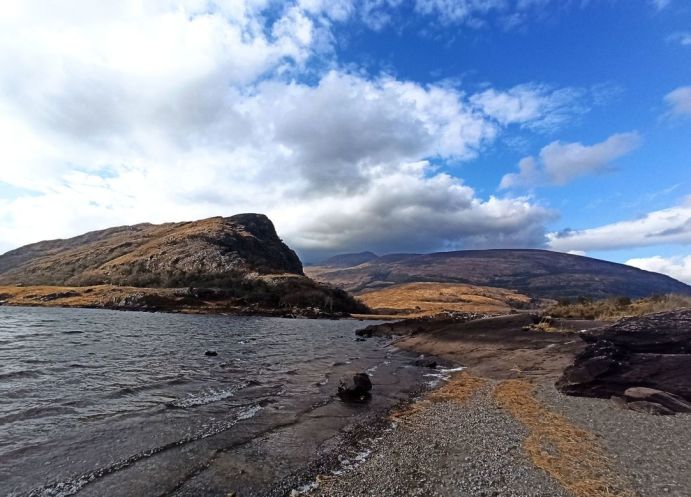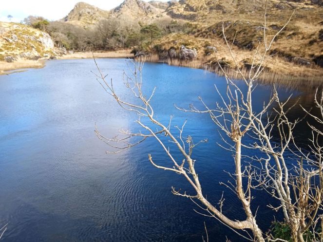 Горное озеро Muckross Lake , в которое впадает водопадный ручей, в лучах смилостивившегося к нам солнца выглядело великолепно (явление солнца на небе в это время года в Ирландии – не очень частое явление из-за морского климата).