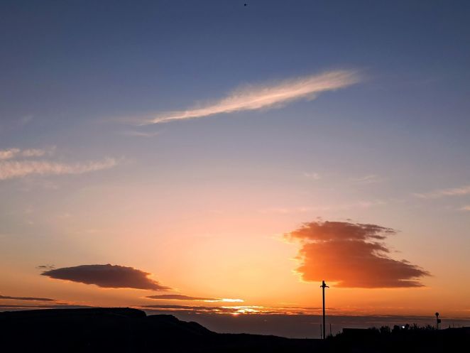 А вот своенравная погода Ирландии позволила лишь налюбоваться неповторимыми красками облаков во время восхода. Я даже умудрился поймать вид серпообразных страт высоко над горизонтом. Костя с учётом специфики его работы назвал это явление WiFi на небе. Я вполне согласился с таким образным сравнением формы облаков.