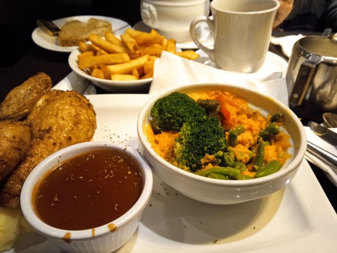 Костя заказал на ужин что-то не очень обильное, точно не помню и кофе, Тим выбрал рагу с большим количеством овощей, а я, дабы не попасть впросак в «чужой стране», выбрал самое узнаваемое – Roast Chicken - жареный цыплёнок, он и в Африке цыплёнок.