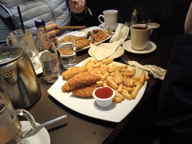 Меню дневной еды, традиционное для Ирландии, как и в любой стране мира, отличается от привычного мне понятия обеда (здесь это питание в полдень принято называть словом ланч). Я выбрал курицу, и не прогадал по вкусу, но…был слегка обескуражен обильностью еды. Сказать, что я очень наелся – значит сильно преуменьшить состояние сытости. А вот порция чая, выбранная мной к обеду, не поражала объёмом чашки. Впрочем, по просьбе Тима принесли простую питьевую воду в достаточном количестве. И мне тоже перепало некоторое её количество для того, чтобы запивать блюдо, сдобренное множеством приправ.