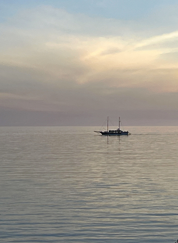 …На следующий день было солнечно, но местами облачно. Местами – это над Маркотхским горным хребтом. С берега очень красиво, однако, был нюанс – у нас по плану было посещение парка Олимп, как раз на этом самом хребте. Но это совсем другая история. А пока на повестке немного видов с набережной от 6 мая 2023 года, очаровательное раннее утро – посидеть у воды, подышать морем и вернуться обратно в отель к завтраку.