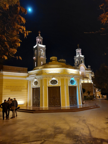 Внутрь заходить не стала: платка у меня с собой не было, да и времени тоже. Окрестности построенной в 1914 году мечети (недавно хорошо отреставрирована, вся в золоте) несколько диковатые: похоже, тут был частный сектор, который недавно снесли. Зато я увидела Донжон и с внешней стороны расположенных рядом очередных ворот старого города дворец «Исмаилийе» (1913 г.) – бывшее здание Мусульманского благотворительного общества, а ныне президиум Академии наук Азербайджана. Здание сгорело в ходе боев 1918 года, но потом было восстановлено. Жалко, что восточный фасад почти скрывают деревья парка им.М.Сабира, азербайджанского классика начала 20 века.