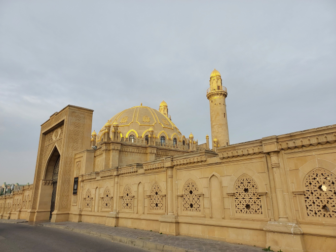 После музея зашла в расположенный неподалеку торговый центр Deniz (Море), внешне чем-то напоминающий здание сиднейской оперы. Тряпки меня не интересовали, а вот к вину приценилась. Точно такого же, как в самолете, не было, но тех же производителей были. На пробу взяла более дешевое, другого производителя – оказалось очень даже приличное, хотя не уверена, что гурманы бы закатывали глаза от восторга. Отнесла добычу в гостиницу, проложила маршрут к Аллее почетного захоронения – посетить могилу Муслима Магомаева. До поездки я как-то не задумывалась, где его похоронили. Точнее, была уверена, что в Москве. Яндекс сказал, что идти не так уж и далеко, но он не знал, что я решу срезать и в результате нарежу лишних кругов по старому городу. Ну и еще пойду посмотреть на мечеть Тезепир, заметную издалека.