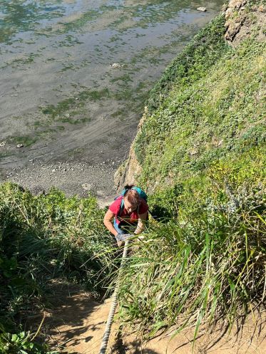 искупались и собравшись с силами двинулись к Столбчатому. От этого места было два пути: первый по берегу вдоль скал, вернее по скалам (по вулканическим выступам) над водой, второй по верху скал. Голосованием мы выбрали второй путь. Вел нас не гид, а проводник. Сказал, что угол подъема меньше 45 градусов, но я ему не поверила. Ну, может быть, меньше в самом начале, когда мы карабкались туда на четвереньках, хватаясь за кусты. А в лесочке, на наше счастье, от дерева к дереву были привязаны веревки, за которые мы и цеплялись. Естественно, делали остановки, чтобы отдышаться. В какой-то момент, наверное, чтобы нас подбодрить, проводник сказал, что ему так же тяжело, просто он быстрее восстанавливается. Конечно, мы ему поверили! Чтобы себя успокоить. А вид сверху был вознаграждением.