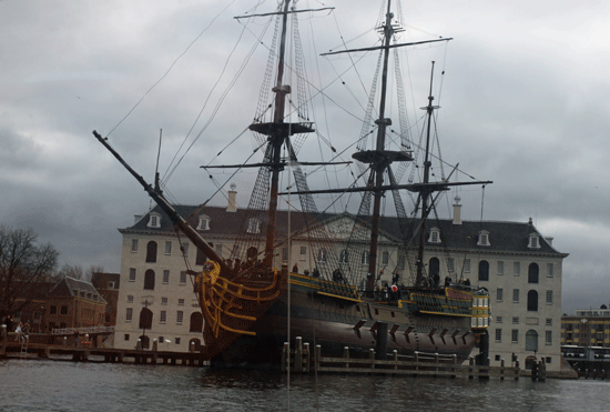Экскурсию сопровождает аудио гид на нескольких языках (русского нет), и первым пунктом программы является самый глубокий и широкий канал Амстердама, где расположен морской музей и стоит большой корабль.