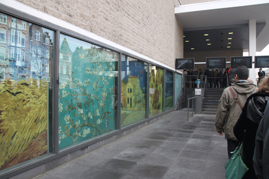 Музей представляет собой современное здание, украшенное большими репродукциями картин Ван Гога. На входе мы преодолели небольшую очередь в кассу – минут на 10, хотя в сезон, думаю, можно простоять и больше.