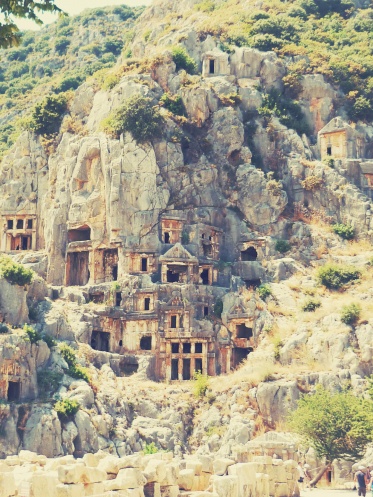 Недалеко от церкви Св. Николая, на склоне горы, находится Некрополь. Его сразу можно принять за скальный город. Иногда появляется такое ощущение, что из какого-нибудь окна выглянит человеки с диким удивлением воззрится на тысячи туристов , болтающих на разных языках мира и безконца щелкающих своим фотоаппаратом. Многочисленные гробницы Некрополя удивляют всех людей. Они вдолблены прямо в горы.