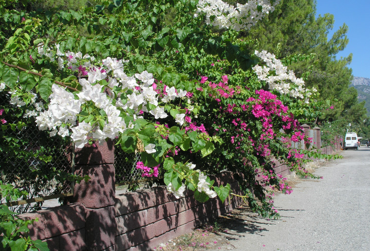 Я пребываю в восторге от турецкой флоры! Апельсиновые деревья – целая аллея при входе в гостиницу. Огромные зеленые апельсины висят гроздьями. Сосны с длиннющими иглами пахнут изумительно. Бананы растут на улицах. В садах - гранаты и инжир. Загороди украшают вьюнки с огромными голубыми цветами. Много цветущих кустов, названий которых я не знаю. На одной улочке белые и розовые грозди усыпали все ветви — но они не пахнут. А вот как входишь в тень огромных сосен — сразу погружаешься в смолистый аромат. И еще вечером усиливается приторный запах мелких беленьких звездочек-цветов на больших кустах — чем-то похожий на жимолость, который Г.В. каждый раз комментирует: