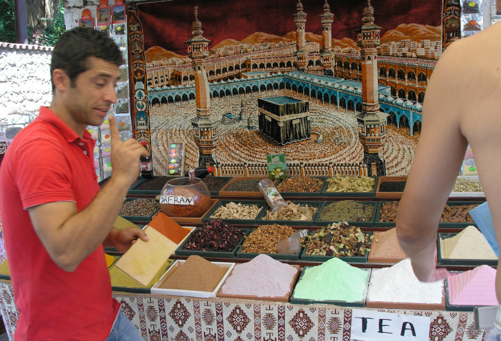 Очередная наша вылазка из пляжного Бельдиби – в Анталию. Бродим по старому городу Калеичи — старинные дома и стены, дерево и камень, восточный базар и домики, переделанные под бутик-отели. Бродим от одной лавочки к другой, рассматриваем экзотику строений сквозь рекламные вывески, развешенные ковры, россыпи бус и витрины с одеждой, кальянами и сладостями. В лавке чаев продавец, бегло говорящий по-русски, угощает нас чаем – яблочным и гранатовым. Растворяет порошок странного цвета в стаканчиках с водой и протягивает нам. Г.В. пробует и задает вопрос истинно северного человека:
