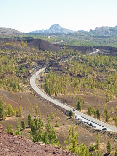 Первая остановка на обратном пути: через 5 минут (слева от дороги стоит одинокое кафе, справа - вулканические глыбы). Со смотровой площадки открывается вид на Тейде и долину с вулканическими породами. Едем дальше и сворачиваем направо по направлению в Los Gigantes (трасса TF-38). Дорога проложена по долине с черными вулканическими выбросами. Вторая остановка: площадка с видом на ту часть вулкана, откуда происходило последнее извержение. До сих пор видны черные следы от потоков лавы. На следующем участке дороги справа видны соседние острова Ла Гомера, Эль Йеро и Ла Пальма, а справа появляются редкорастущие молодые сосенки. Третья остановка: Вулканы Samara и Negros. Все это продолжение национального парка Тейде. Мы поднимались только на вулкан Самара. Его высота составляет 1800 метров над уровнем моря, а отличительной особеннотью являются каменные породы красного цвета.