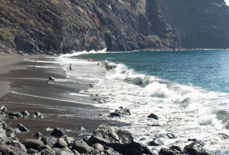 Спустились мы часа за 2 и оказались в центральной части скал Лос Гигантес. Стоишь на диком пляже с черным песком, позади отвесные скалы 800 метров высотрой, а впереди море и волны метровой высоты. Про высоту волн я не преврала, некоторые и больше - с человеческий рост. Подпрыгнешь на такую и может закрутить, как в стиральной машинке.