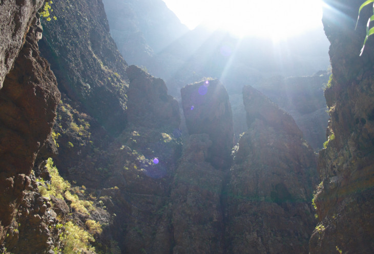 Чтобы все успеть в этот день надо было встать пораньше, но мы разоспались и добрались к деревне Маска ближе к 12 часам дня. Ехать, как и вчера, надо по направлению к Guia de Isora, дальше на Santiago del Teide. В самом городе надо не пропустить очень неприметный поворот на лево (именно поворот. Я забыла написать, что на всем Тенерифе все развязки выпонены в виде круговых движений, а простые перекрестки встречаются не так часто).Вас ожидает не самый крутой, но достаточно продолжительный серпантин. В 12 часов дня уже трудно было припарковать машину у самой деревни, пришлось езхать выше в году, а потом спускаться пешком. В деревушке много кафешек (чуть ли не при каждом доме), так что перед дорогой можно подкрепиться и купить воды, если вы это не предусмотрели заранее. брать надо примерно по литру на человека, если планируете только спуск. И, желательно, обувать треккинговые ботинки. Спукс не трудный, но довольно продолжительный (2-3 часа). Я была в обычных кроссовках и на следующий день очень болели икры. Муж ходил в треккингах и не ощутил ни капли недомогания. И поверьте, дело тут не в спортивной подготовке.