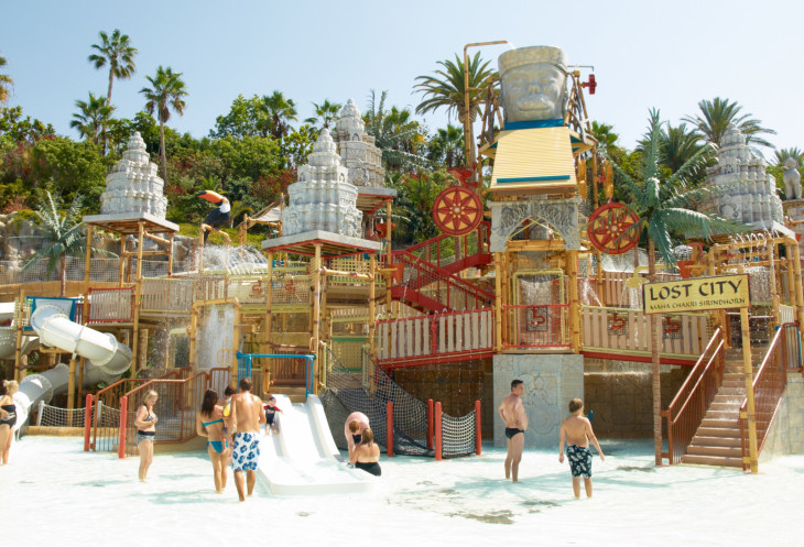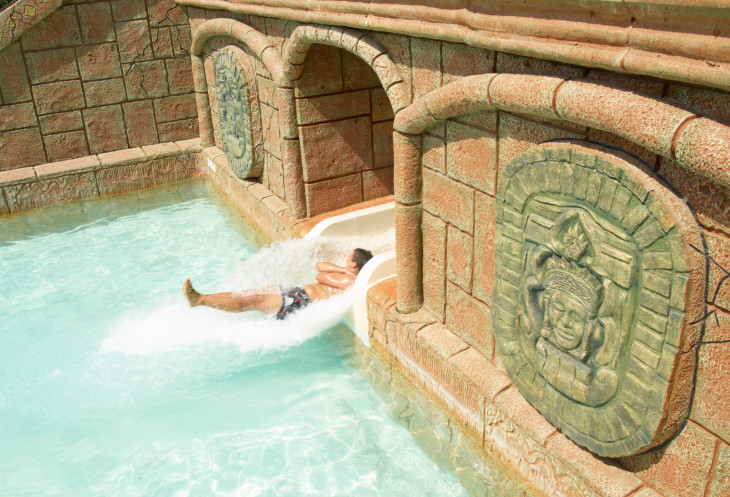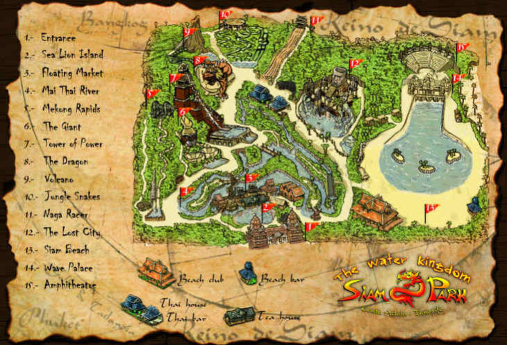 Сначала стоит поплавать по реке Mai Tai River, чтобы познакомиться территорией аквапарка и первый раз за день проплыть сквозь бассейн с акулами. Все остальные горки можно разделить по остроте ощущений (Ориентируемся по номерам на карте аквапарка). Для стара посетите горки № 5, 10, 11. Далее № 8 и 9, Вулкан и Дракон соответственно. Мне лично очень понравился вулкан - единственная горка, на которой я прокатилась пару раз. И напоследок идите на башню Tower of power (№7). Высота ее 28 метров. Скатываться придется без надувных подушек, и именно на ней Вы второй раз попадете в аквариум с акулами, но проносетесь с такой бешенной скоростью, что разгледеть их на этот раз уже не получится. Специально для детей в Сиам-парке есть мини-аквапарк Lost City. Пока малыши равлекаются, родители могут позагорать на стоящих рядом лежаках.