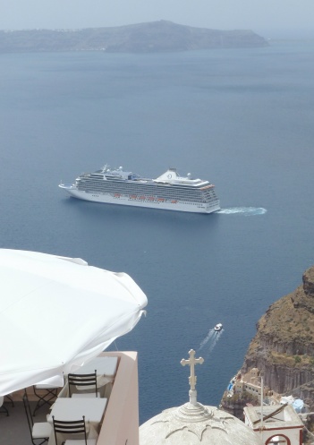 Нагуляв аппетит, мы удобно устроились в маленьком ресторанчике, который буквально парил в воздухе. Какая же красота вокруг! Синее-синее море, черный вулкан, причудливые белые домики на скалах, голубые купола церквей, сливающиеся с небом, двери, открытые прямо в море, полосатые зонтики, а внизу белоснежные лайнеры и юркие маленькие яхты, оставляющие белые следы на синей глади кальдеры. Незабываемая игра белых, сине-голубых, черных тонов.