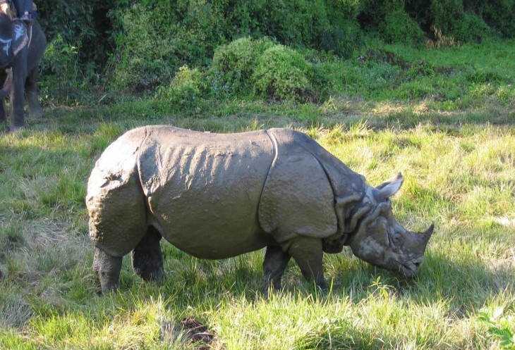 Почти сразу встречаемся с мирно пасущимся носорогом,