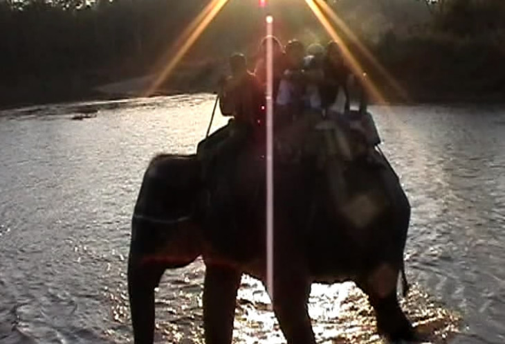 Садимся на слонов, на специально смонтированные для туристов площадки с веревками для безопасности, по четыре человека, плюс шофер. Немного проехав, переправляемся через речку, по которой плавали утром,