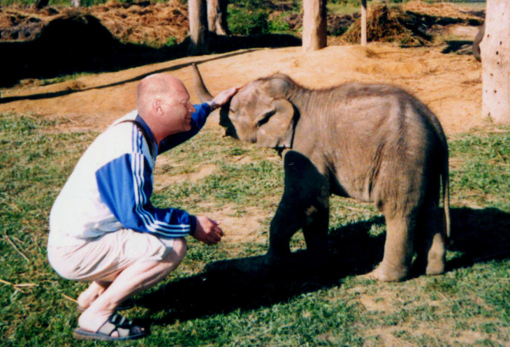 На окраине деревни у них загон для слонов, которых тут используют немножко на всяких тяжелых работах, но, главным образом, для катания туристов на сафари по местным джунглям. В загоне, кроме больших слонов, гуляет совсем маленький слоненок. Очень хочется погладить его. Смотритель сжалился надо мной и, когда наша группа уходит, разрешает ненадолго зайти в загон и сам фотографирует меня с малышом: