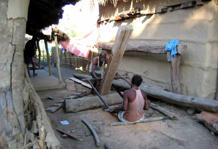 А где же мужики? Может, отдыхают после ночного бдения за носорогами? Конечно, попробуйте сами носорога с огорода прогнать, сразу поймете, как устали. Но нет, видим, что и они не «сачкуют», что-то пилят, режут допотопным инструментом: