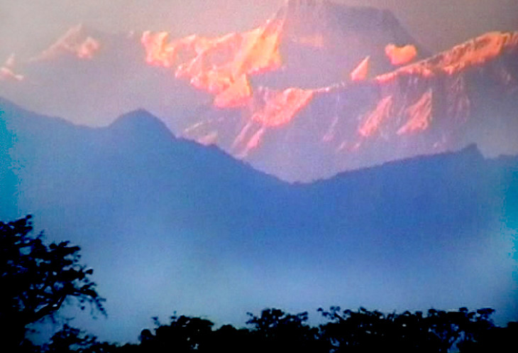 В единственный в то время отель национального непальского парка Читван приезжаем уже на закате. Даже не распаковывая вещи бегу на смотровую площадку на крыше отеля, откуда открывается поразительно красивый вид на гималайские горы, полыхающие ярко-оранжевыми красками заката.