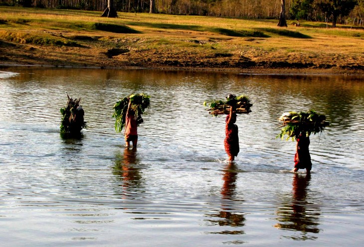 Подойдя к краю деревни, видим, как несколько женщин с вязанками каких-то растений на головах переходят вброд реку.