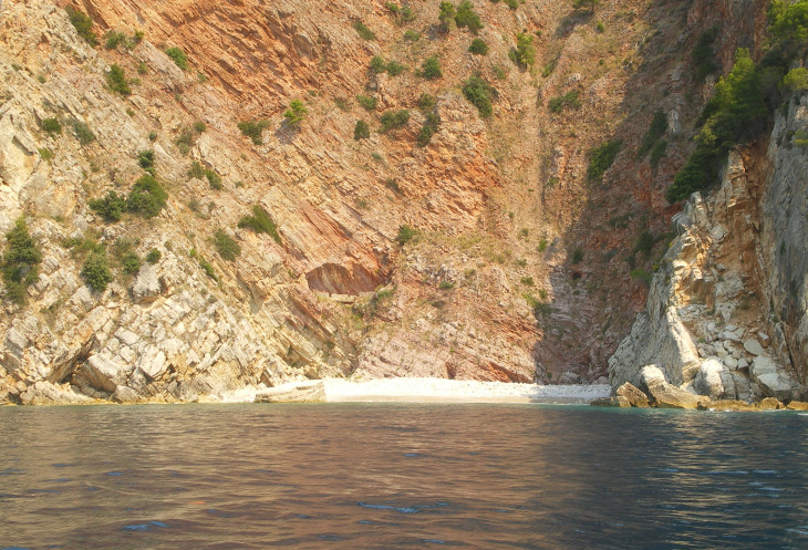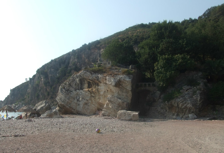 Мы уже на высоте метров 100-150 от моря, внизу – уединенная бухта, закрытая с 2х сторон отвесными скалами… Понимаю, почему был построен этот туннель – это единственная «нижняя» дорога не по морю от Режевичей до Петроваца. По морю сюда – даже не на катерах, а, наверное, только на скутерах и лодках доплыть можно…. (на дне – крупные камни видим) Вот и стоит один такой скутер… А на берегу – парочка сидит… в недвусмысленной позе… хм… кажется, мы помешали… (за нами ещё группа голосистых туристов…) Ибо, когда я в следующий раз глянула вниз – скутер был на месте, а влюбленные, видимо, скрылись под скалой…