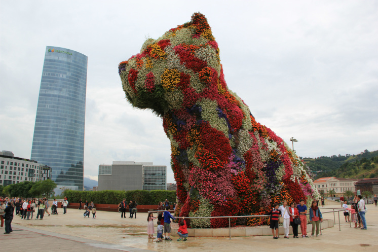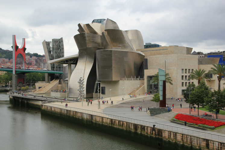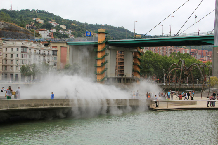Следующая остановка Бильбао. Холодно после жаркого юга. Всего восемнадцать градусов тепла. Я пожалел, что не взял в дорогу теплых вещей. Паркуем машину и торопливым шагом направляемся к главному месту посещения этого промышленного города - Guggenheim Bilbao Museoa.