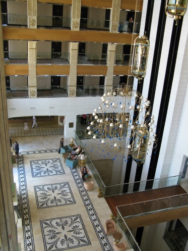 После обеда поднявшись на 3 этаж и выйдя из лифта, мы из любопытства повернули направо по коридору и направились к окну в его конце. На полу очень красивый, ухоженный настоящий ковёр, на потолке точечные светильники, смонтированные на позолоченных плоских панелях в стиле огромной позолоченной чаши расположенной над люстрой в фойе отеля,