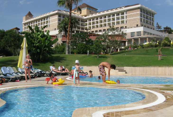 Так как прибрежная полоса моря является государственной собственностью, то по ней можно беспрепятственно ходить в любом направлении, поэтому посторонних ходоков в этом районе предостаточно. Так же постоянно ходят и торговцы всякой мелочью от свистулек до одежды. Чинно, туда-сюда, проезжают на небольших лошадях турки, предлагающие прокатить вашего ребёнка, бегают незлые собаки. Лежат и загорают небольшие молодёжные местные весёлые компании, пару раз неторопливо проехал джип Ford с улыбающимися полицейскими. Не так назойливо, но в прибрежной, примерно 20 метровой, полосе жизнь течёт городская, а не отельная изолированная и охраняемая. Это относится прежде всего ко всем отелям расположенным с западной стороны от Сиде. Поэтому с детьми лучше стоять рядом, и дорогие вещи на песочке беспечно не оставлять. На верхнем бассейне есть небольшие горки, а вот совсем детских конструкций для водных развлечений нет вообще. Не могу не отметить невнимательного звукотехника группы аниматоров, который включает мощный усилитель на 2 акустические колонки, направленные через нижний бассейн на ту самую детскую «восьмёрку». В результате все развлечения под музыку для взрослых, устраиваемые группой аниматоров каждый день с 11 часов, превращались в дискомфорт для детей. Но благодаря большой территории отеля, мы всегда находили уютные и спокойные места, для нашего отдыха.