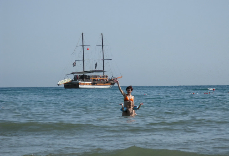 Наслаждаясь пением местных воробьев, мы утолили свой голод не сводя глаз с бесконечно синего моря. Но встать и просто уйти купаться у нас не получилось, «Папа смотри мороженое!» с восторгом обнаружил в зале ресторана сын. «Фисташковое пожалуйста» отчеканил сынишка и получив его в руки сразу же откусил кончик рожка снизу – «интересный однако подход к делу» засмеялись мы и направились по горячему песку к манящему прибоем морю. Недалеко от берега на волнах качалась двухмачтовая яхта с чёрным флагом с черепом и костями.