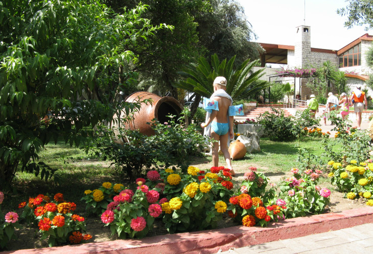 и большой разросшийся куст алое на развилке у ресторана, по аллейке, заросшей виноградом, направились в нижний бассейн. Там же находится и детский бассейн «восьмёрка», так для простоты его позже назвал мой сын.