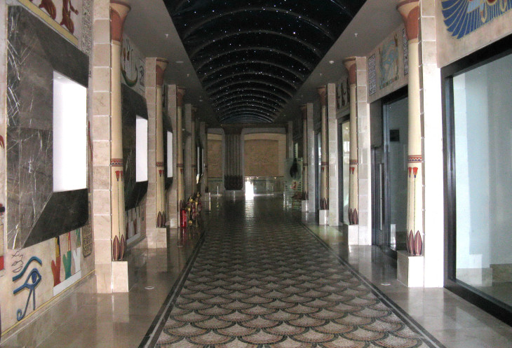 На стенах роспись в египетском стиле, слева крытый бассейн, джакузи, бронзовые кошки на входе в СПА,