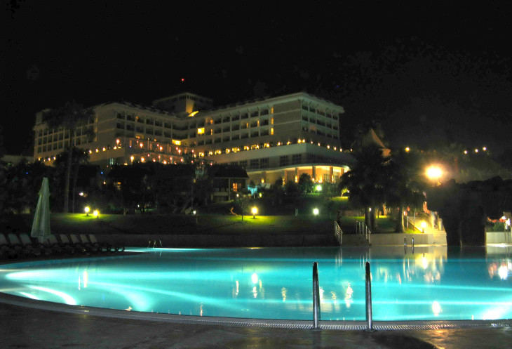 На часах 21:40 и уже было совсем темно. Отель предстал во всём великолепии своей ночной иллюминации. Цепляясь за каждый источник света, глаза старались запечатлеть всю непередаваемую словами, созданную заботливыми руками человека, гармонию игры света и тени.