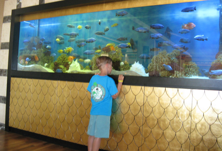 и удобно устроившись, я, у приветливо улыбающегося официанта, заказал напитки. Проголодавшийся сын с удовольствием съел и пюре и тушеное мясо быка и « капустные деревья», так он любит называть цветную капусту, и десяток палочек картофеля фри, 2 куска сахарного арбуза, яблоко и откинувшись на диване хитро запел – « мини мини диско, мини мини диско»! Официант часто подходя и указывая на пустую тарелку говорил с улыбкой «финиш?» и оставалось только улыбнуться и кивнуть головой. Так до конца ужина улыбка по этой, да и не только по этой причине с лица и не исчезала. Оставив доллар на столе, мы опустились по чудо-эхо лестнице к магазинчикам. Но мамин шопинг быстро прервался. Услышав звуки музыки детской дискотеки, доносившейся из амфитеатра за верхним бассейном, сын, подпрыгивая то на одной, то на другой ноге, устремился через мостик вниз, по каменной дорожке к впечатлениям от начинающегося мини-диско.
