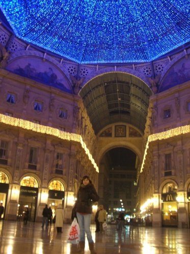 Там наверняка будет праздник, и мы надеялись встретить новый год в дружной интернациональной компании. В отеле я быстро привела себя в порядок, хоть в ресторан и не пойдем, но русские девушки всегда должны быть на высоте! Конечно, вечернее платье я надевать не стала, но обтягивающие джинсы, сапоги на каблуках и праздничный макияж присутствовали. За пол часа до наступления Нового года, мы, прихватив бутылку шампанского и одноразовые бокалы, выдвинулись из отеля. Праздничная иллюминация на улицах, веселые спешащие прохожие и отличная погода. Настроение было отличное! Еще на подходе к площади мы услышали выстрелы петард и веселые возгласы молодежи. Каково же было наше удивление, когда, выйдя к собору, мы увидели следующую картину. Кучки туристов были разбросаны по всей площади, а по периметру стояла итальянская молодежь и бросала им в ноги петарды, которые разрывались перед иностранцами, заставляя их подпрыгивать от испуга. Никакого организованного концерта, шоу не было. Только на огромном плазменном экране отсчитывались последние минуты уходящего года, и играла музыка. Мы решили подождать и присоединились к группам несчастных, которые ждали праздника. И в тоже мгновение стали мишенью для буйных итальянцев. Мы попытались передвигаться по площади, ища укромное местечко. Напрасно! Нас везде доставали эти новогодние снайперы. Несколько раз, подпрыгнув дабы избежать опасности и проделав фуэте достойного сцены Ла Скала, муж принял решение прорвать оцепление и искать укрытие. Благо перед нами сиял огнями знаменитый миланский пассаж- галерея Витторио Эммануила, аналог нашего ГУМа.