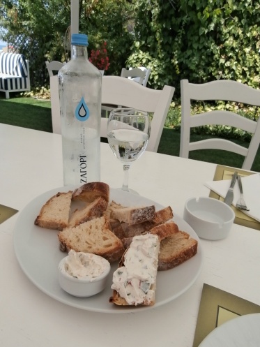 4. Тарамосалата- приготовленный из протертого хлеба и отварного картофеля (!!!) с щедрым добавлением чеснока и зелени. Я не совсем поняла зачем нужна помазка к хлебу, состоящая из хлеба и картофеля, уж больно НАЖОРИСТО)))