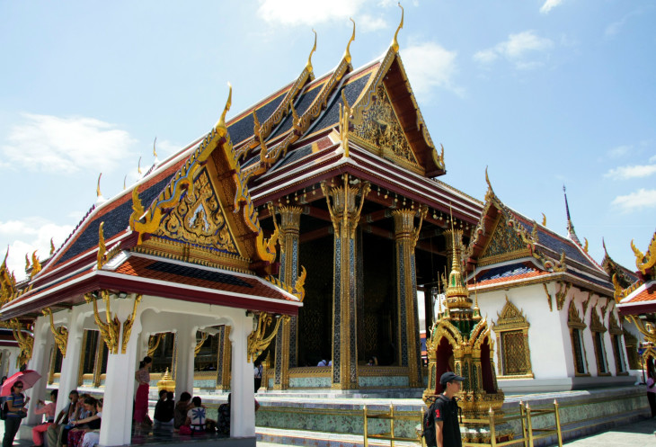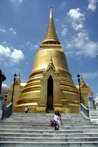 Королевский дворец, суета на входе и жаркое солнце… Мы совсем забыли, что на территории Королевского дворца женщинам надо прикрывать все свои соблазнительные места: плечи, коленки, пятки. Поэтому нами принудительно на входе к достопримечательности была куплена соответствующая синтетическая женская одежда. Солнце и золото храмов были очень ярким, и дочка все время ходила с закрытыми глазами и хныкала. Ведь родители забыли взять солнцезащитные очки.