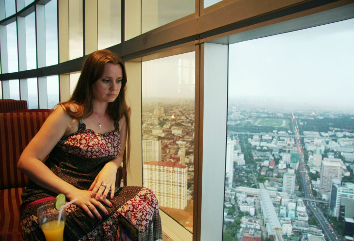Кому платить и сколько было совершенно непонятно. В стоимость пребывания на высоком этаже входило посещение кафе на 83 этаже. Садимся в другой лифт, и мы уже за столиками с панорамой Бангкока. В стоимость посещения входил всего лишь алкогольный коктейль. Посасывая лечебный напиток, мы наблюдали темнеющий и одновременно вспыхивающий Бангкок, начало сильного дождя, усиление ветра и скрипучее покачивание 83 этажа. Над нами, на 84 этаже, была смотровая площадка, которая крутилась и скрипела все время. Но смелости залезть туда во время разгула непредсказуемой стихии мы в себе не нашли.