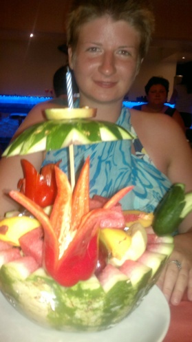 А тем временем наступил обед, и пора оценить кулинарию отеля. И опять-таки, я очень обрадовалась. Много салатов, суп, десерт, всё свежее, вкусное, разнообразное – всё замечательно! К еде я больше возвращаться не буду, опишу сразу. На завтрак была колбаса, в обед какое-то мясо – мне по вкусу не понравилось, но стоит всё-таки понимать, что в этой стране с животноводство в принципе тяжело, и на что тогда рассчитывать? Курица вкусная была, шаурма – отменная, рыба нежная, арбуз и сливы сочные сладкие, яблоки – кислые на любителя – на меня, вот дыня, да не дозрела. Десерты – необыкновенные – но у меня, к сожалению, крайне редко доходило до них дело, потому, что я от пуза, наедалась овощами, супами, рисом и макаронами. А в праздник, турецкой ночи, ребята нарезали красиво фрукты и так же творчески подходили к оформлении столов.