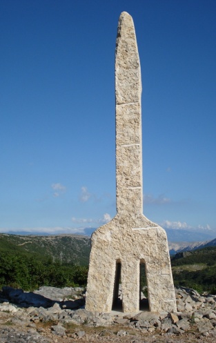 После Крка решили посетить еще один прибрежный городок, Башку, название которого было на слуху. По дороге увидели высокий монумент в форме перевернутой вилки в живописном месте и решили остановиться. Когда подошли поближе, все оказалось еще лучше, чем виделось с дороги. Потрясающий вид. Горы, долина внизу, море вдалеке между вершинами... Фотографировались, пока не замерзли. Температура была градусов на десять ниже, чем на побережье.