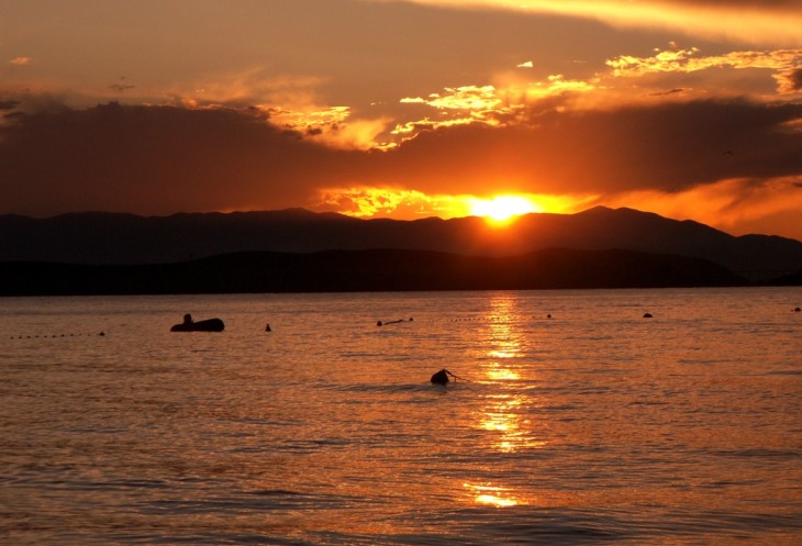 Свободное место мы все-таки нашли. Искупались. Особого удовольствия не получили. И берег, и дно действительно каменистые. Без специальных тапочек практически не обойтись. Можно, резумеется, бросаться в воду прямо от берега, но в этом случае большая вероятность оцарапать о камни живот. Решили завтра о тапочках позаботиться, а сегодня уж как-нибудь так.