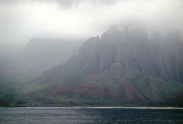 Север острова Кауа’и – это фантастический Na Pali Coast. По-гавайски «na pali» означает «скалы». По-моему, это самая великолепная часть острова. Зазубренные скалы с тропическими лесами и низвергающимися водопадами использовались в качестве задника более чем в 40 голливудских фильмах. Вертолет, летящий на остров динозавров в ленте Спилберга (вспоминаете?), пролетает между скал Na Pali Coast, а потом медленно снижается вдоль высокого водопада и садится на маленькую площадку. Когда видишь такую природу не на экране, а вокруг себя, впечатления переполняют еще очень и очень долгое время.
