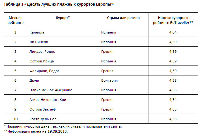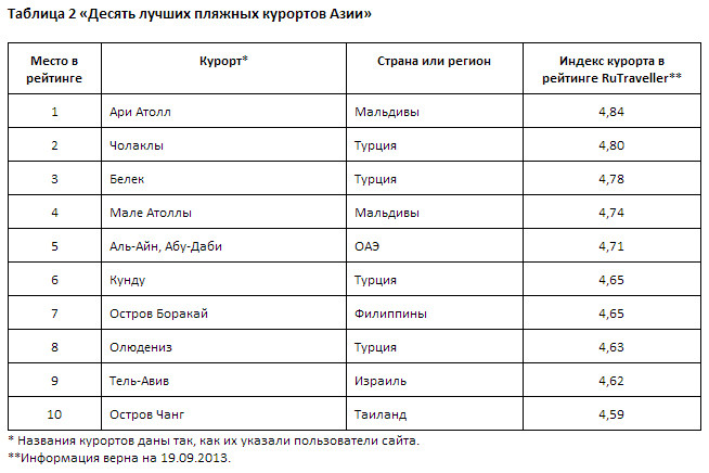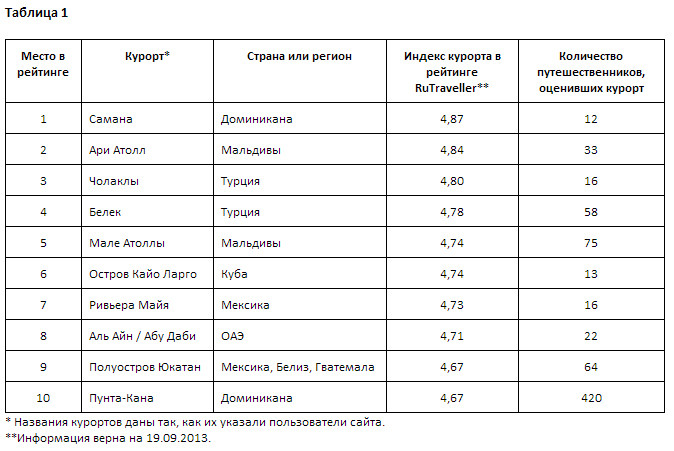По данным рейтинга и, главное, по показателям популярности курортов, можно сделать вывод, что пристрастия путешественников имеют тенденцию перемещаться с пляжей Европы и доступных стран Азии шире в западном и восточном направлениях. Лидируют Доминиканская Республика, Мексика и Мальдивские острова.
