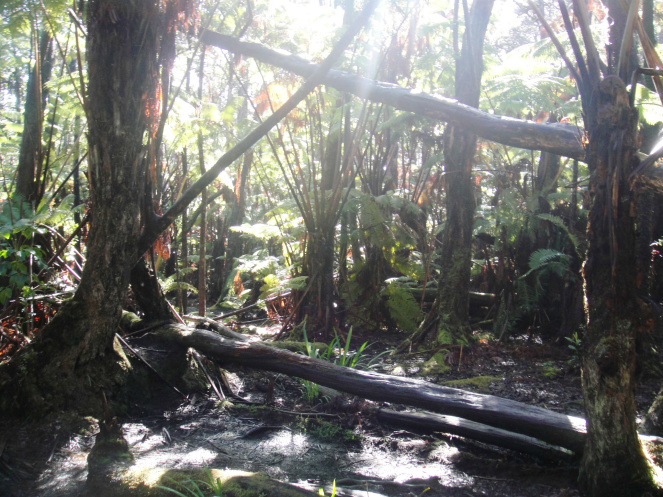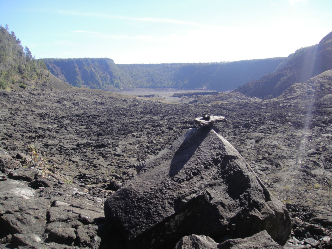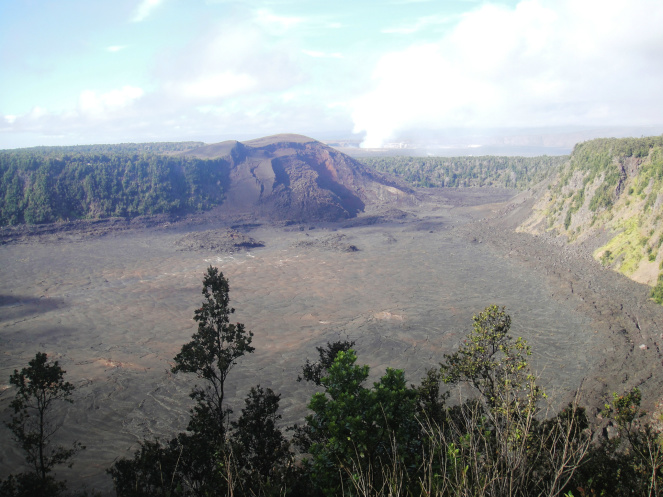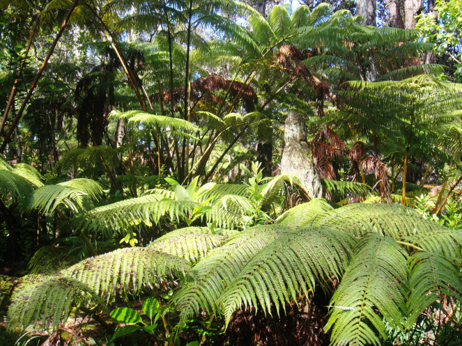 Что же делать в парке? Рекомендую: поход через дремлющий кратер вулкана, где было извержение много-много лет назад. Сначала вы пойдете сквозь древние джунгли с гигантскими папоротниками, мхом и прочей доисторической растительностью. Потом по камням спуститесь на застывшую поверхность огромного кратера и по жаре и зною, как малорослики через Мордер, пойдете к его противоположной стороне. По пути будете изучать разломы в застывшей лаве, цветущие алые цветы богини Пеле и радоваться такому экзотическому приключению.