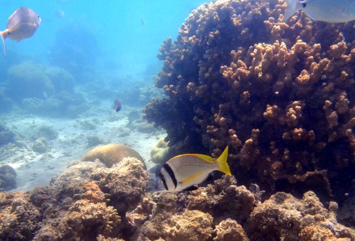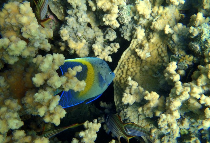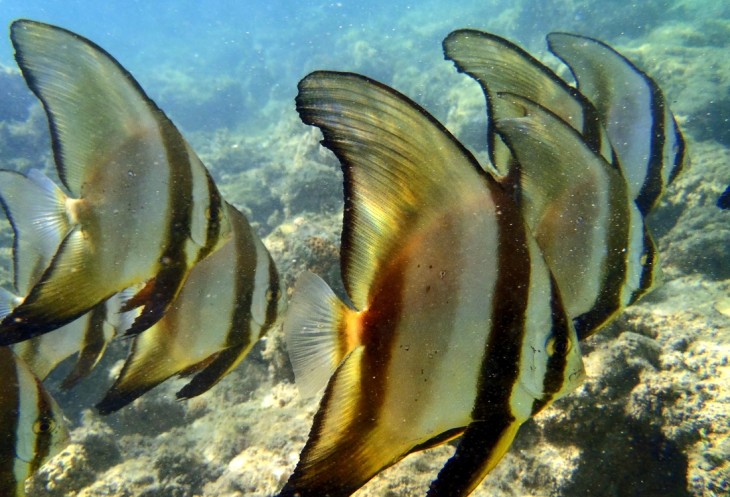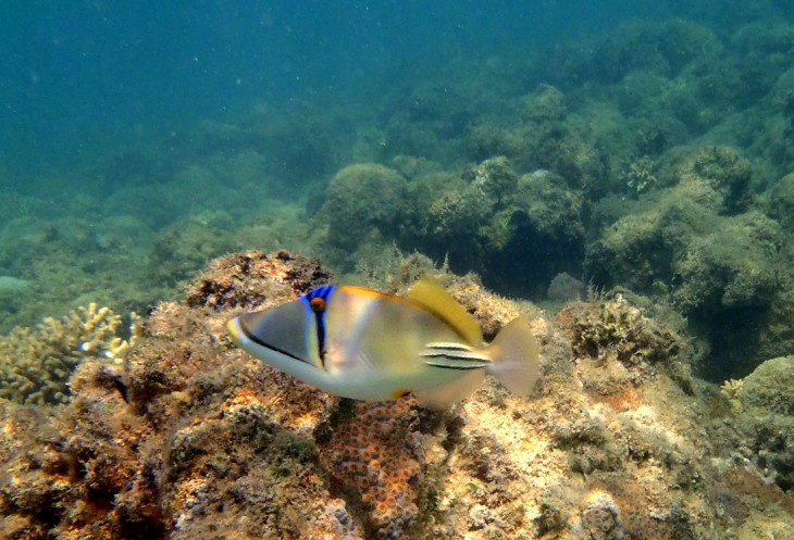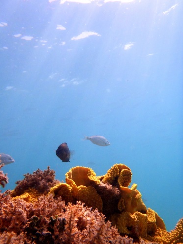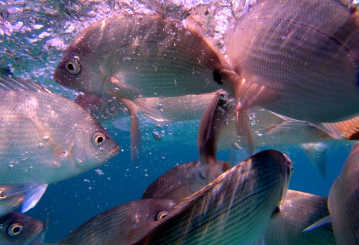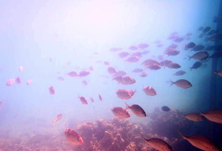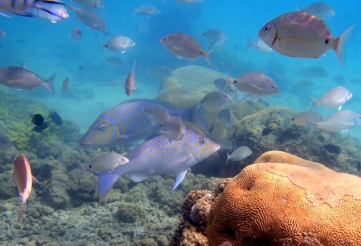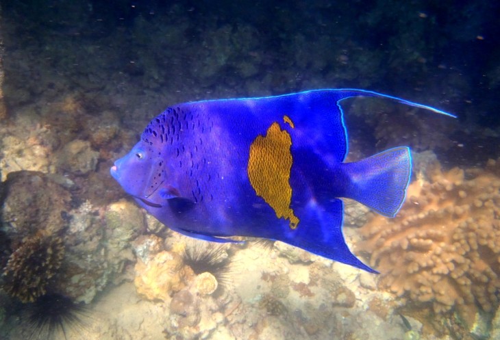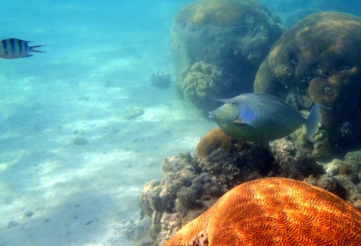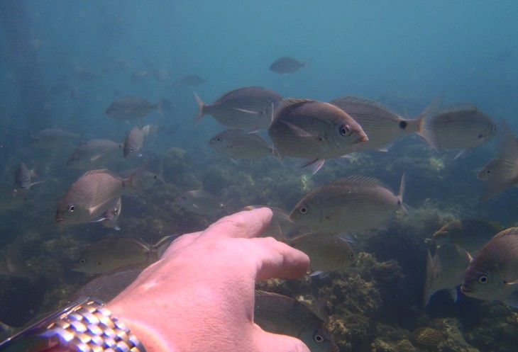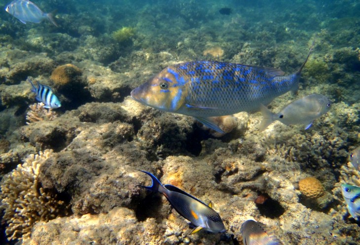 Говорят, что рыба слабовата мозгами. Не знаю как где, но здесь у нее все в порядке. На второй день нырянья из глубины выплыл голубой рыб, размером с хороший такой журнальный столик, напугав до полусмерти. Не увидев зубов, решил, что он добрый. Следующий ныр покормил его коркой хлеба, а дальше - стоило только залезть в воду, как откуда-то из темной глубины появлялся рыб и верно сопровождал.