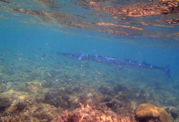 Жутко пугала двухметровая барракуда, которая стрелой появившись откуда-то сбоку, хватала завтракующую из моих рук рыбу и стремительно исчезала.