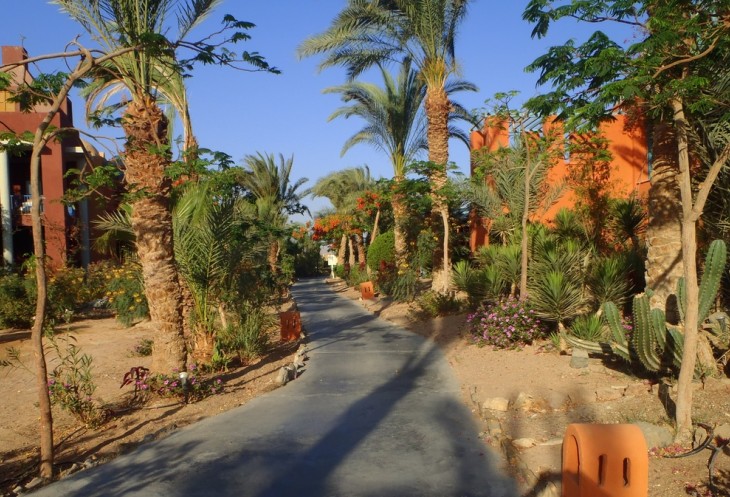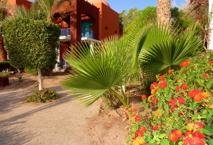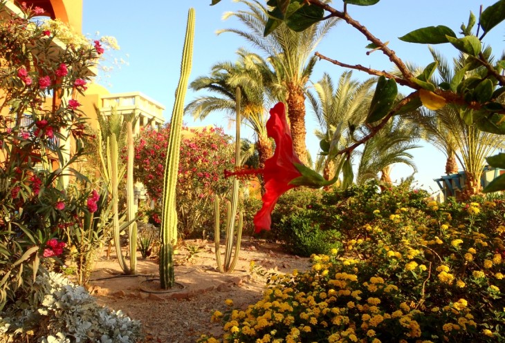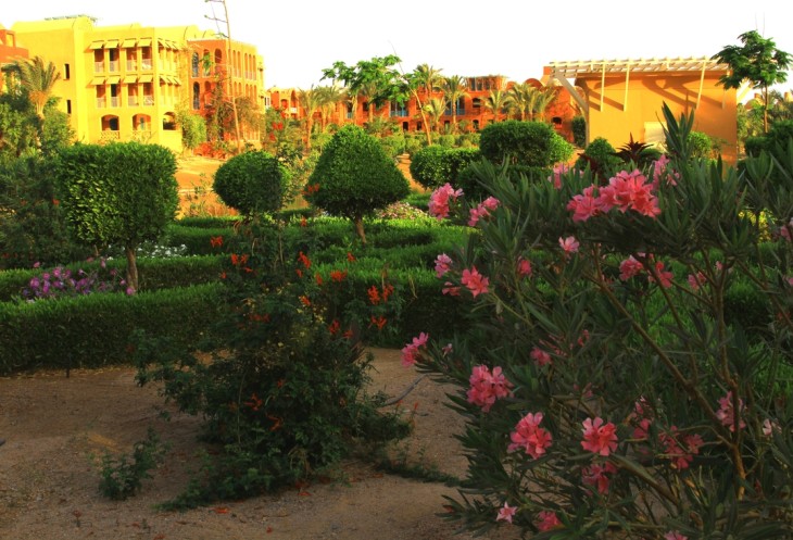 Отдельно следует сказать о саде отеля. Эль Гуна расположена в пустыне и здесь ничего не растет само по себе. Требуется огромный труд, чтобы какая-нибудь зелень украсила улицы. Отель же утопает в зелени, территория его представляет собой великолепный сад. Пожалуй, больше таких отелей здесь и нет. Moevenpick Resort & Spa El Gouna 5* больше напоминает санаторий советских времен (из-за многочисленных этажных корпусов), а зелени маловато. Steigenberger El Gouna 5* славится гольф-полями. У других отелей территории практически нет вообще.