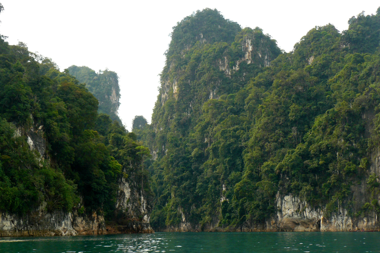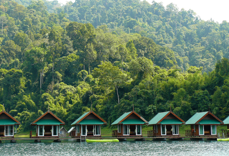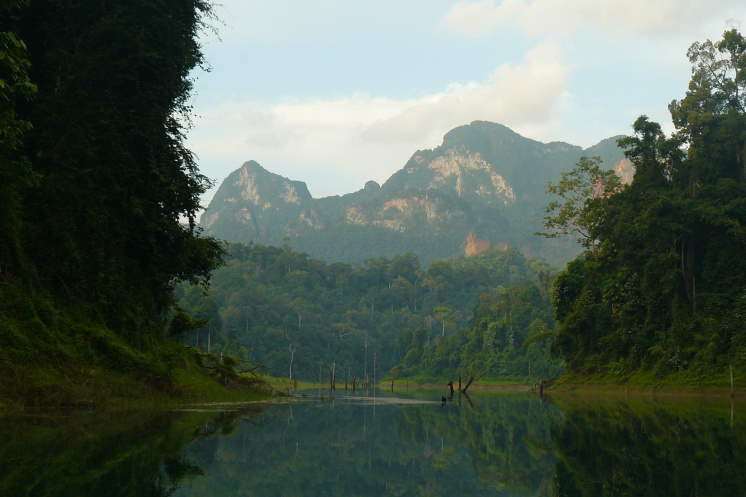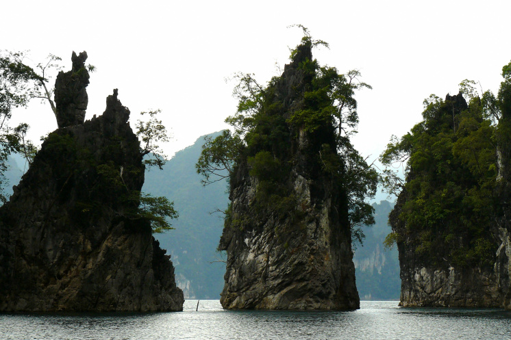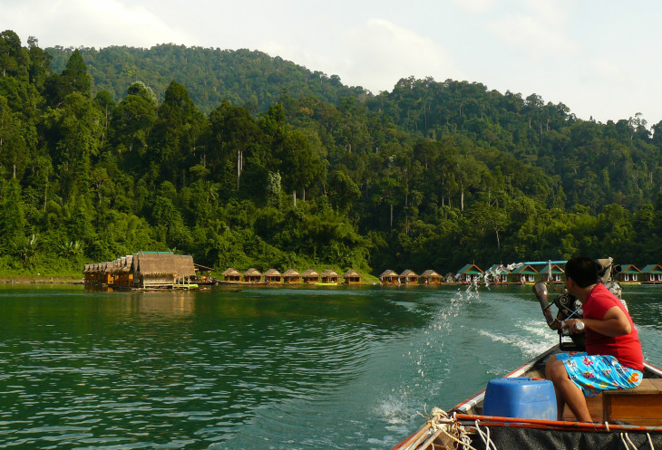 На пирсе к нам сразу же подошли с предложением аренды лодки и домика на озере. За 3400 бат мы получили в свое распоряжение лодку (с лодочником) на сутки и домик с полным пансионом (опять же на сутки). Минут через 30 мы уже были в нашем рафтхаусе. Пейзажи абсолютно не похожи на те, что мы перевидали в Таиланде за 3 недели.