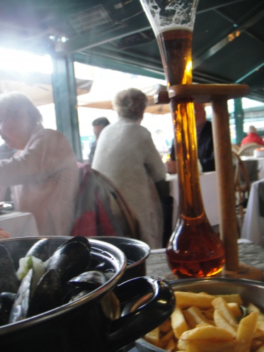 Мы не страшимся включиться в «безумства» Греты, а потому заказываем бельгийскую питейную достопримечательность – пиво «квак» (Kwak), который подают в бокале в виде гигантской колбы. Непринужденно снимаем один свой ботинок, и бармен кладет его в корзину, подвешенную к потолку. В «Грете» есть традиция: обувь возвращают, только если клиент допивает «квак» до конца.